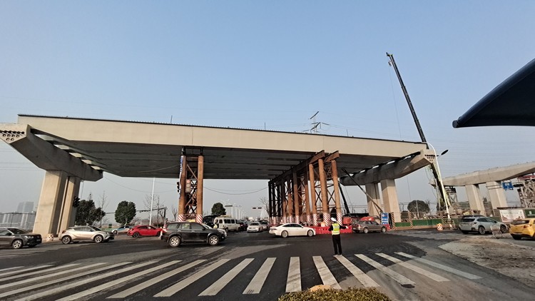 綠云路洋江西路口由于其地理位置的特殊性,一直以來備受市政府和廣大群眾的關(guān)注,為積極落實(shí)好該路口施工及交通導(dǎo)行,在業(yè)主城投集團(tuán)城建公司領(lǐng)導(dǎo)的支持和幫助下,項(xiàng)目部多次與交管部門進(jìn)行對(duì)接并最終確定方案,一方面在每晚十點(diǎn)到次日凌晨五點(diǎn)進(jìn)行施工,并采用500T大型吊機(jī)進(jìn)行吊裝,采用吊機(jī)一次站位即實(shí)現(xiàn)全區(qū)域吊裝來節(jié)約路口吊裝占用時(shí)間,盡量減小對(duì)交通影響。同時(shí)在白天加大路口交通協(xié)管員的投入,保證路口通行安全有序。