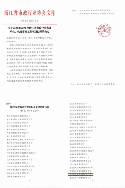 3月7日,浙江省市政行業(yè)協(xié)會(huì),浙市政業(yè)(2023)7號(hào)文件,我單位評(píng)為“2022年度浙江省市政行業(yè)先進(jìn)單位”。