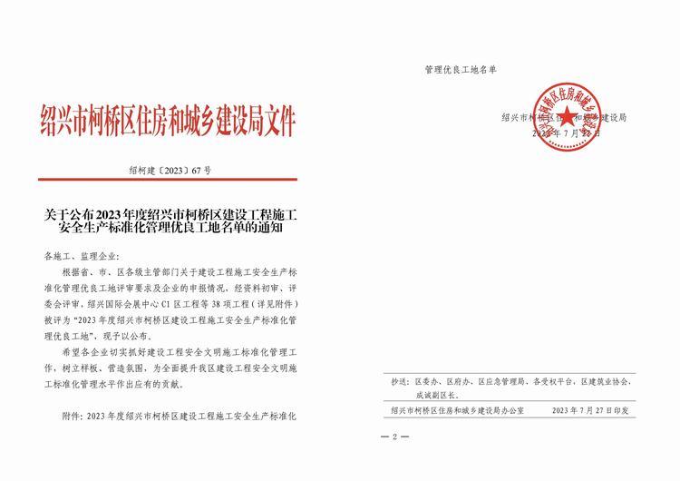 紹興市柯橋區(qū)住房和城鄉(xiāng)建設(shè)局發(fā)布《關(guān)于公布2023年度紹興市柯橋區(qū)建設(shè)工程施工安全生產(chǎn)標(biāo)準(zhǔn)化管理優(yōu)良工地名單的通知》,由我司承建的錢清鎮(zhèn)中心幼兒園新建工程項目和蘭亭研學(xué)游營地(蘭亭國際書法交流中心)兩個項目被評為“2023年度紹興市柯橋區(qū)建設(shè)工程施工安全生產(chǎn)標(biāo)準(zhǔn)化管理優(yōu)良工地”!