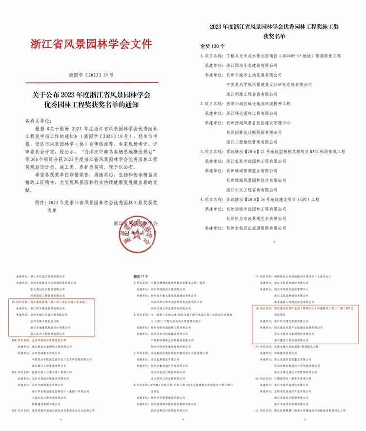 • {id=815, tenantId=null, version=null, appId=null, viewType=null, sourceApp=null, useViewType=false, authData=null, jsAuthority=null, title=喜訊——第二工程公司承建項目斬獲多個獎項!, type=1, summary=近日,浙江省風(fēng)景園林學(xué)會發(fā)文浙園學(xué)(2023)39號文,關(guān)于公布“2023年度浙江省風(fēng)景園林學(xué)會優(yōu)秀園林工程獎公布文件”的通知,我司承建的二個項目,葭沚老街改造一期工程(先行區(qū)施工總承包)榮獲“優(yōu)秀園林工程獎施工類金獎”,紹興集成電路產(chǎn)業(yè)園(皋埠片區(qū))環(huán)境提升工程(二期)EPC總承包項目榮獲“優(yōu)秀園林工程獎施工類銀獎”。, keywords=, createDate=1696902003000, modifyDate=1696902003000, pubDate=1696902003000, showFlag=true, topFlag=false, recommandFlag=false, viewCount=0, linkUrl=null, targetFlag=false, mobileTitle=喜訊——第二工程公司承建項目斬獲多個獎項!, mobileSummary=近日,浙江省風(fēng)景園林學(xué)會發(fā)文浙園學(xué)(2023)39號文,關(guān)于公布“2023年度浙江省風(fēng)景園林學(xué)會優(yōu)秀園林工程獎公布文件”的通知,我司承建的二個項目,葭沚老街改造一期工程(先行區(qū)施工總承包)榮獲“優(yōu)秀園林工程獎施工類金獎”,紹興集成電路產(chǎn)業(yè)園(皋埠片區(qū))環(huán)境提升工程(二期)EPC總承包項目榮獲“優(yōu)秀園林工程獎施工類銀獎”。, author=, source=, showMobileFlag=true, accessPermission=, showOrder=815, showStyle=, topOrder=0, content={id=815, tenantId=null, version=null, appId=null, viewType=null, sourceApp=null, useViewType=false, authData=null, jsAuthority=null, pcContent=