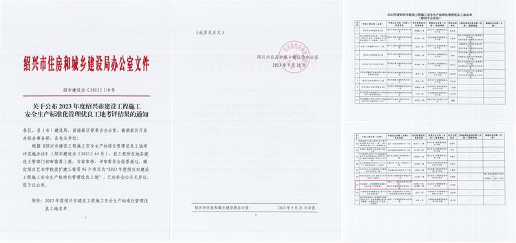S308省道(二環(huán)西路智慧快速路)改造工程(非涉鐵段)榮獲“2023年度紹興市建設(shè)工程施工安全生產(chǎn)標(biāo)準(zhǔn)化管理優(yōu)良工地”。