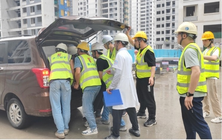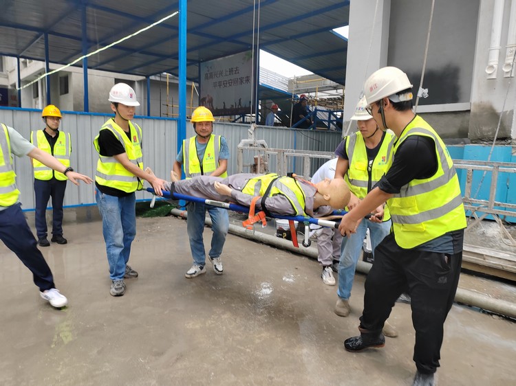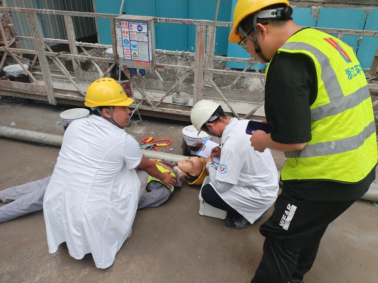 隨著本次演練指揮長吳總一聲令下,演練正式開始。本次應(yīng)急演練主要流程為吊籃操作工違規(guī)作業(yè),不慎從吊籃上墜落,項(xiàng)目經(jīng)理得知消息后,立即組織各應(yīng)急小組啟動(dòng)搶救程序。救護(hù)組對(duì)現(xiàn)場做好警戒圍擋,嚴(yán)禁圍觀人員拍照;醫(yī)療組檢查傷者情況,當(dāng)即判斷必須盡快送至醫(yī)院;指揮組安排應(yīng)急車輛進(jìn)場,后勤組對(duì)接就近醫(yī)院安排傷員接收事宜;救護(hù)組將傷者轉(zhuǎn)移到應(yīng)急車輛上,過程中防止傷者二次受傷,醫(yī)療組隨車陪同送至醫(yī)院治療。